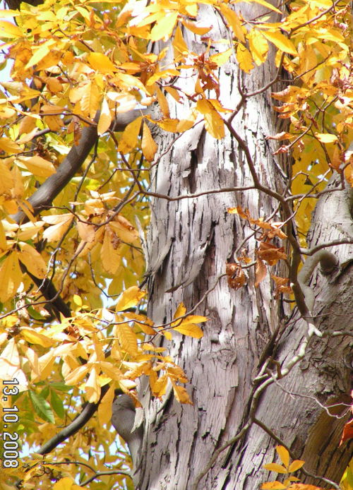 Niezwykłe wrażenie robi kora na pniach i grubych konarach orzesznika pięciolistkowego -szarobrązowa, dość jasna złuszcza się wąskimi pasami, luźno wiszące ponad metr długie skutecznie utrudniają wspinaczkę amatorom niedojrzałych owoców.